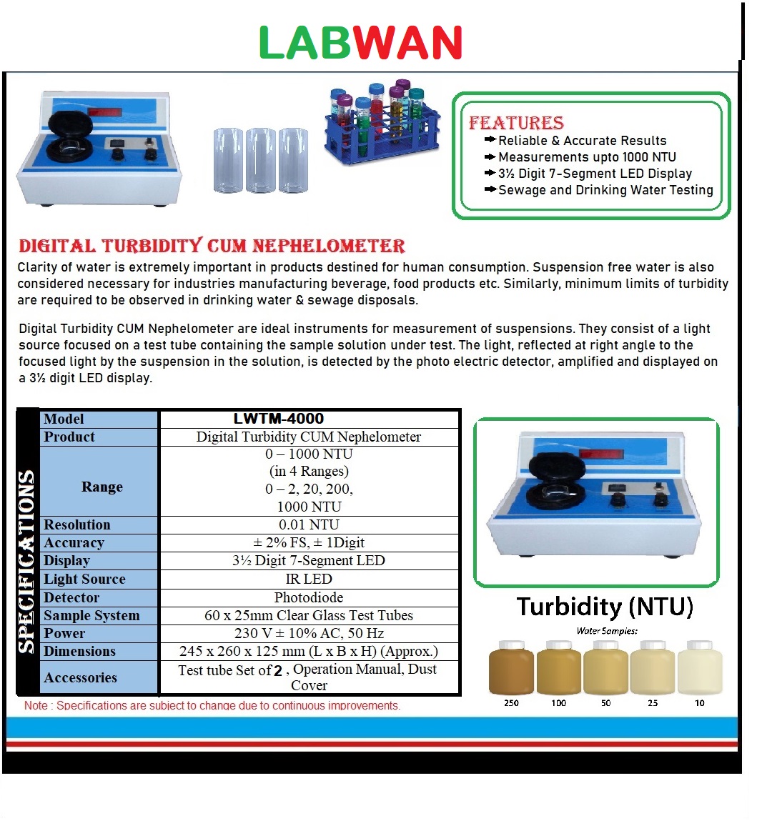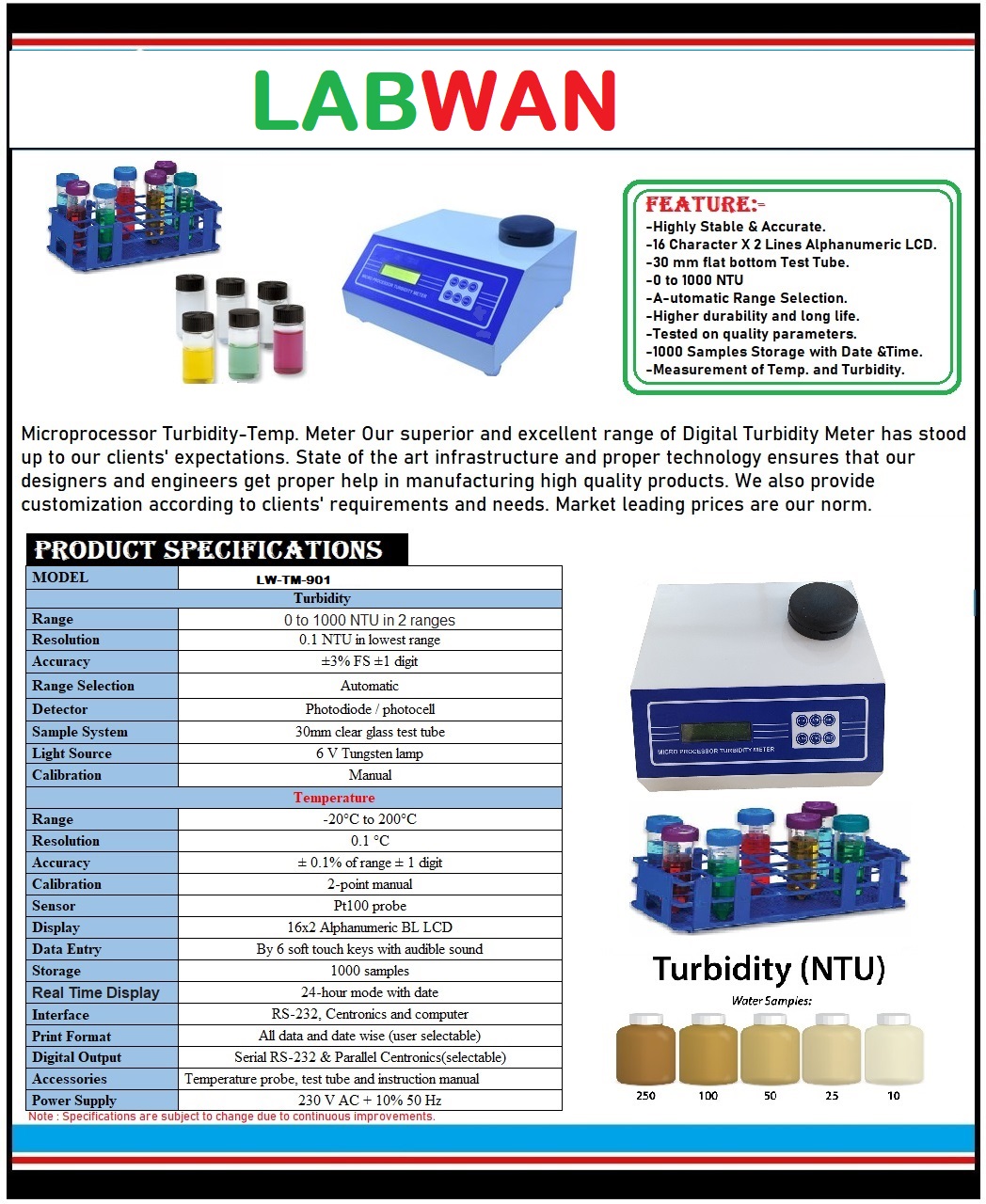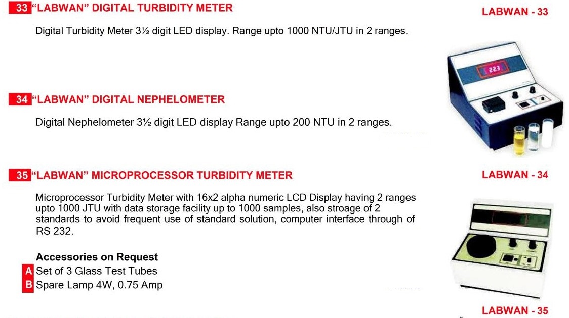 Turbidity/Nephelometer Contact us for Pricing and Further Details of LWTM-4000 Contact Us for Pricing and Further Details of LW-TM-901 Contact Us for Pricing and Further Details of LABWAN-35